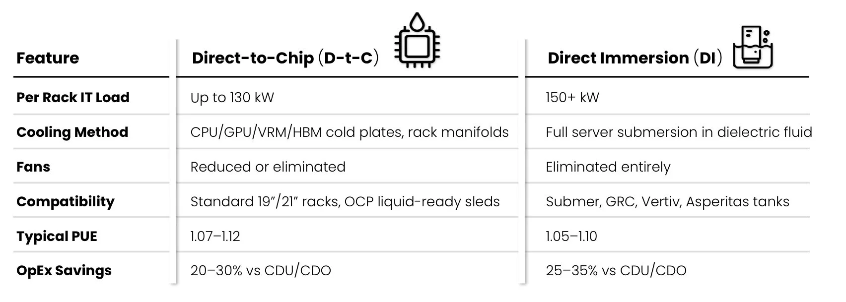 The HaloDrive Cooling Engine supports two high-efficiency cooling paths: Direct-to-Chip (D-t-C) for retrofit and cold-plate deployment and Direct Immersion (DI) for ultra-dense, fanless AI clusters.